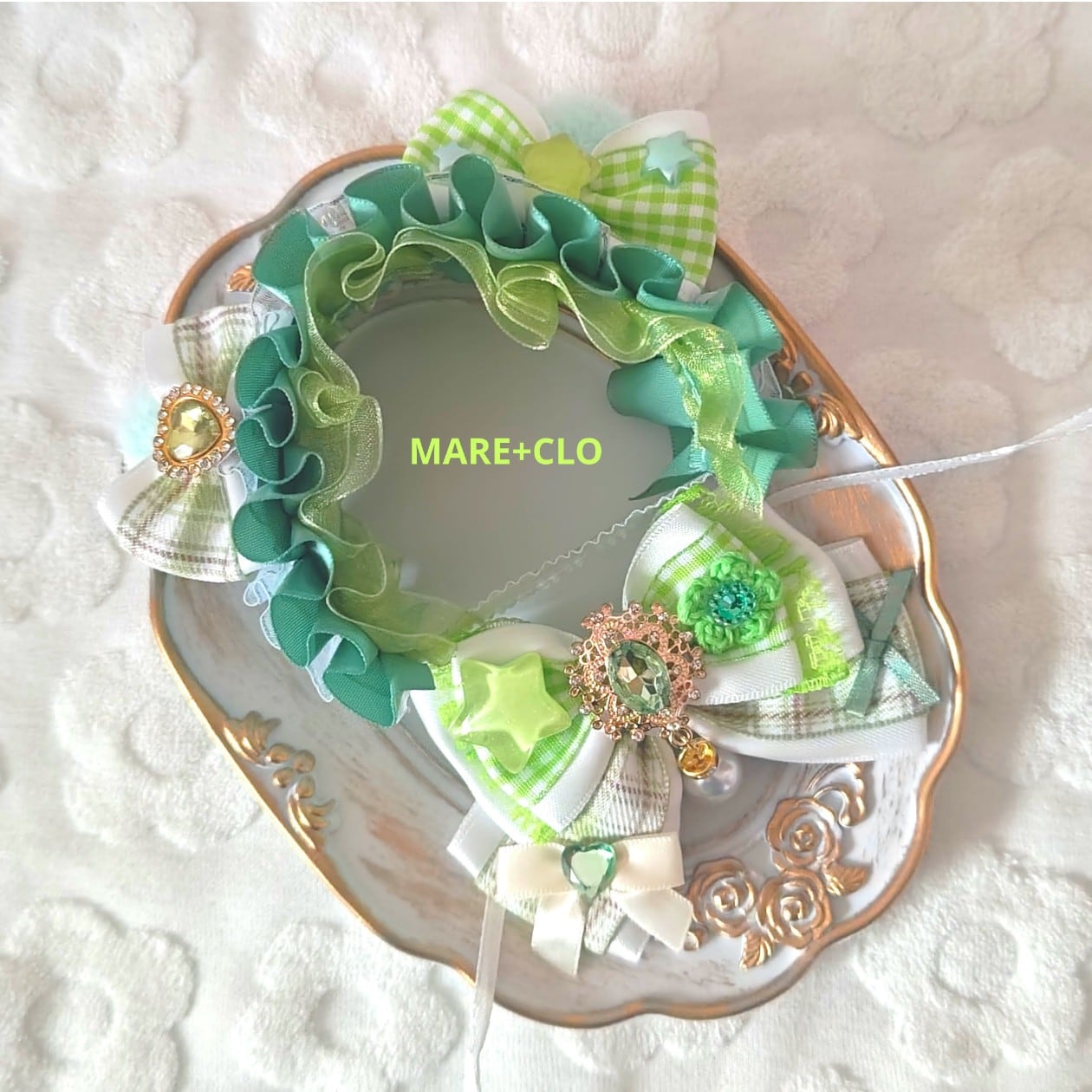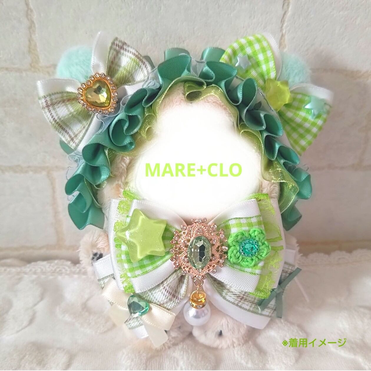 18 ぬい服 11〜13cm ぬいぐるみ用 ヘッドドレス リボン 黄緑 ねこ耳