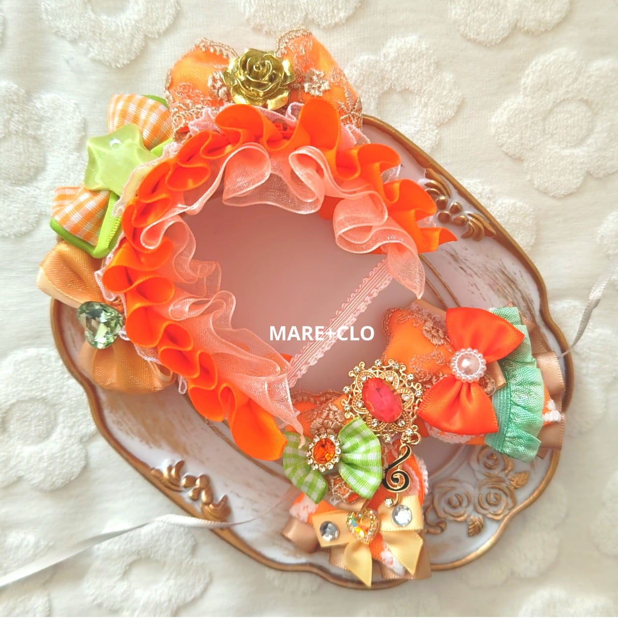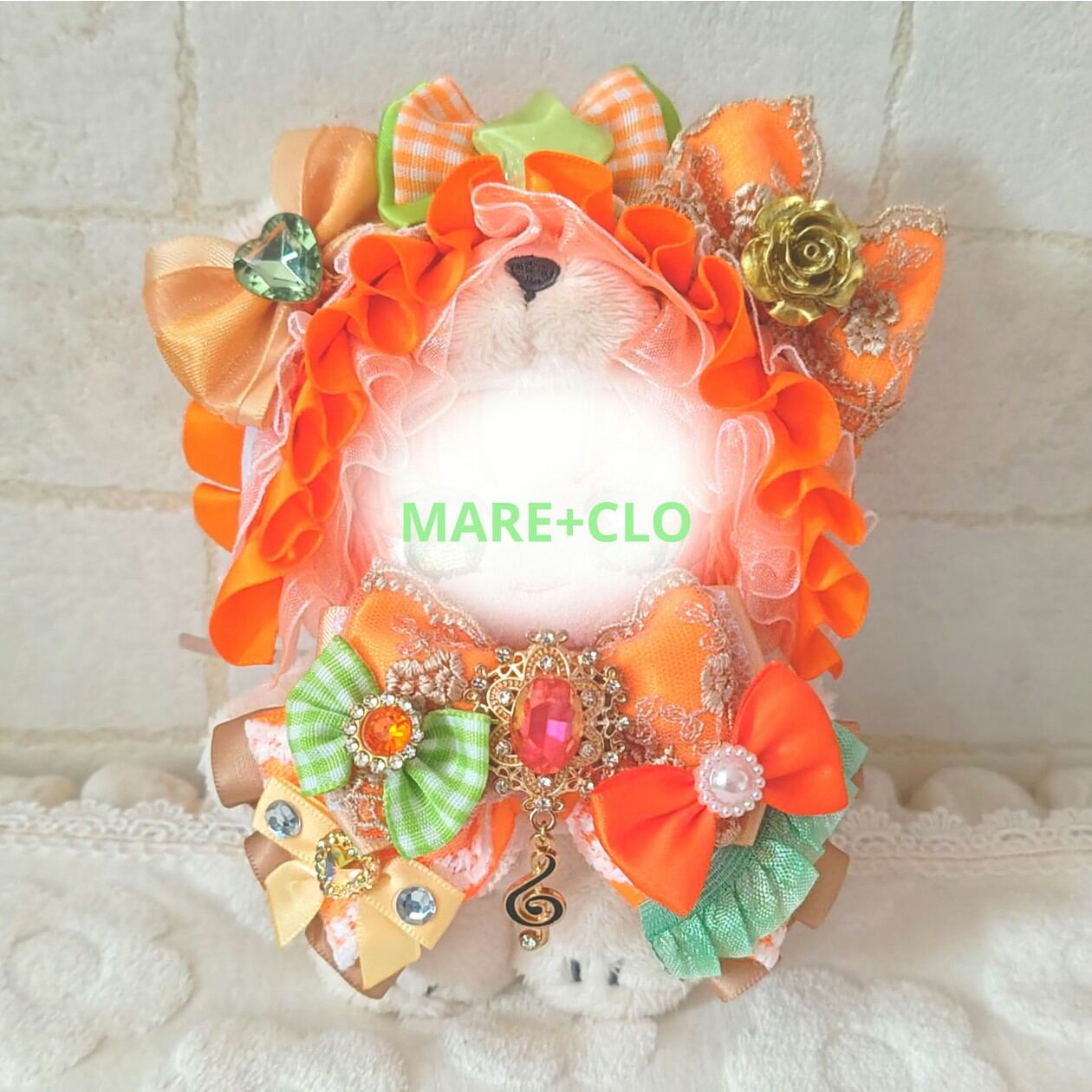 100 ぬい服 ヘッドドレス リボン 11〜13cm レース ぬいぐるみ用 オレンジ